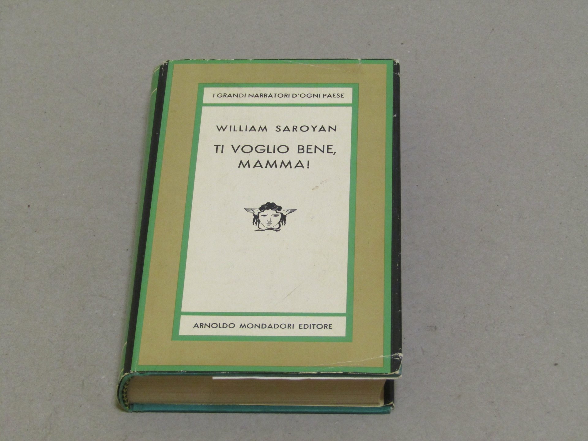 William Saroyan William Saroyan. Ti voglio bene, mamma!. Milano, Mondadori 1970 - IV italiano, in sedicesimo pp.288 Romanzo. Copertina cartonata con sovraccoperta. Pagine e sovraccoperta ingiallite. Sovraccoperta lievemente usurata ai bordi e strappata in alcuni punti. Angolo inferiore dell'aletta posteriore della sovraccoperta tagliato.