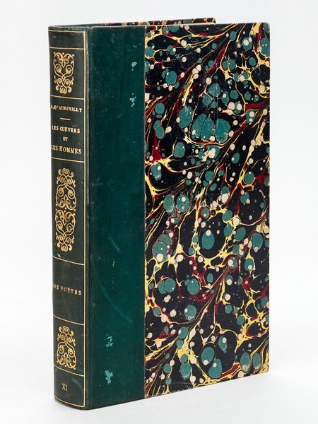 1 vol. in-8 reliure demi-veau vert, dos lisse orné en long, tête dorée, couvertures conservées, mention XI au dos en queue (onzième volume de la deuxième série), Les Oeuvres et les Hommes, Maison Quantin, Paris, 1889, 1 f. blanc, 3 ff., 360 pp. et 1 f. n. ch. Remarquable exemplaire enrichi d'un envoi rédigé par la secrétaire de Barbey Louise Read, avec cachet de signature à l'encre rouge, et adressé à Jean Alboize. Jean Alboize avait racheté à Arsène Houssaye la fameuse revue "l'Artiste" en 1881 ; Barbey y publia quelques poèmes à partir de 1884. La monographie consacrées aux dédicaces de Barbey, publiée chez Blaizot en 1908, signale plusieurs envois à Alboize. Bon exemplaire (infime frott. au mors, ex-libris baron Raymond Auvray, très bon état par ailleurs) pour cet exemplaire du tirage ordinaire de l'édition originale (avec 12 hollande et 9 japon), dédicacé par Barbey d'Aurevilly, alors malade et âgé, et qui mourra cette même année 1889 ; c'est Louise Read (1845-1928), son célèbre "ange noir" tout à la fois gouvernante et secrétaire qui s'est chargé de rédiger la dédicace. Dans ce beau recueil, il évoque Ronsard, La Fontaine, Chénier, Agrippa d'Aubigné, Victor Hugo, Heine, Barbier, Lamartine, Arckermann, Richepin, Milton, Corneille, Banville, Pichat, Pommier, Monselet, Saint-Maur, Bourget, Rollinat et Vigny. Vicaire, I, 302