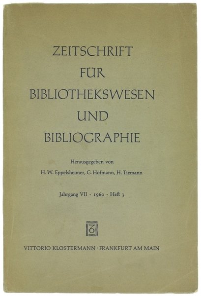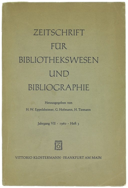 ZEITSCHRIFT FUR BIBLIOTHEKSWESEN UND BIBLIOGRAPHIE. Jahrgang VII - 1960 - Heft 3. | Livres anciens et modernes | Eppelsheimer H.W., Hofmann G., Tiemann H.