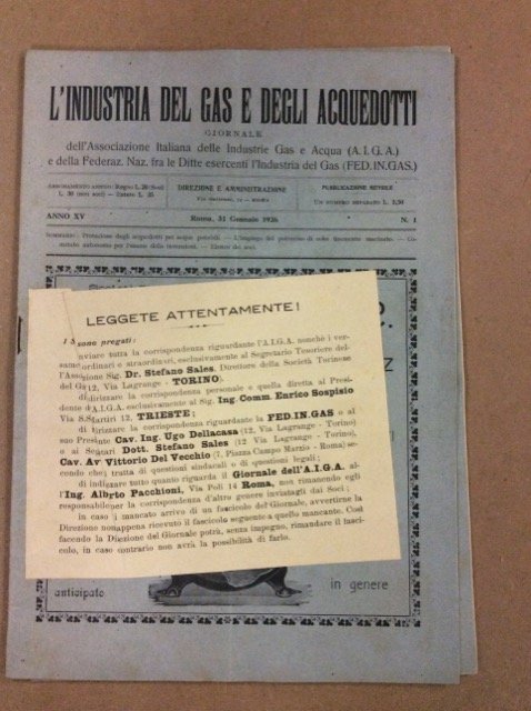 BOLLETTINO DELLA ASSOCIAZIONE ITALIANA DELLE INDUSTRIE GAS E ACQUA. - Dal 1919 la rivista si intitola: L' industria del gas e degli acquedotti. Giornale dell'Associazione italiana delle industrie gas e acqua (A.I.G.A.).