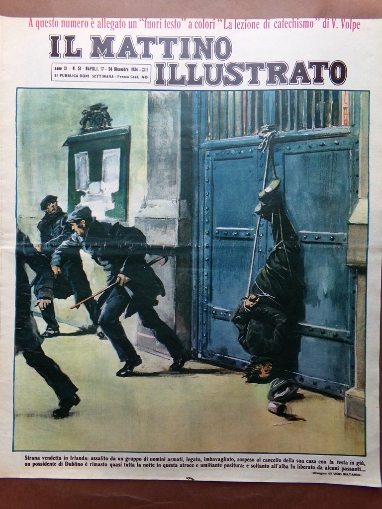 Strana vendetta in Irlanda: assalito da un gruppo di uomini armati, legato, imbavagliato, sospeso al cancello della sua casa con la testa in giù un possidente di Dublino è rimasto quasi tutta la notte in questa atroce e umiliante positura: e soltanto all'alba fu liberato da alcuni passanti. (Ugo Matania)