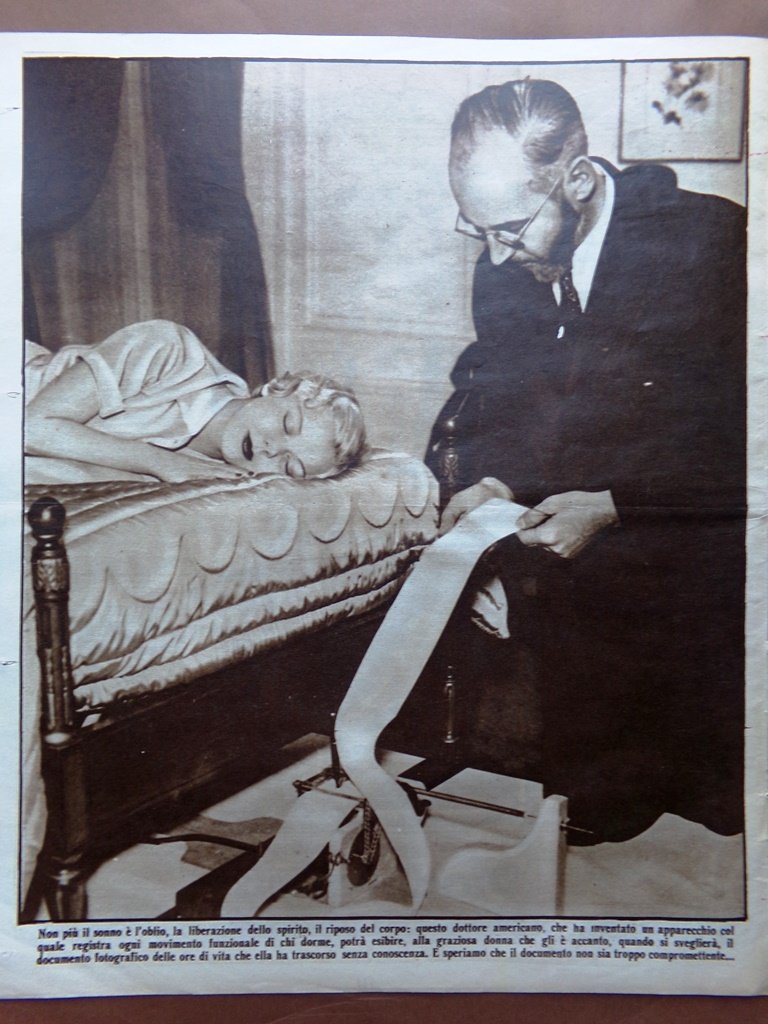 Non più il sonno è l'oblio, la liberazione dello spirito, il riposo del corpo: questo dottore americano che ha inventato un apparecchio col quale registra ogni movimento funzionale di chi dorme, potrà esibire, alla graziosa donna che gli è accanto, quando si sveglierà, il documento fotografico delle ore di vita che ella ha trascorso senza conoscenza. E speriamo che il documento non sia troppo compromettente.