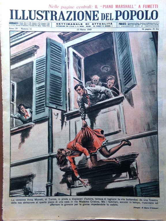 La ventenne Anna Moretti di Torino, in preda a dispiaceri d'amore, tentava di togliersi la vita buttandosi da una finestra della sua abitazione al quarto piano di una casa in via Madama Cristina. Ma i familiari, accorsi in tempo, riuscivano ad afferrarela giovane per la gonna impedendole la caduta (Mario D'Antona)