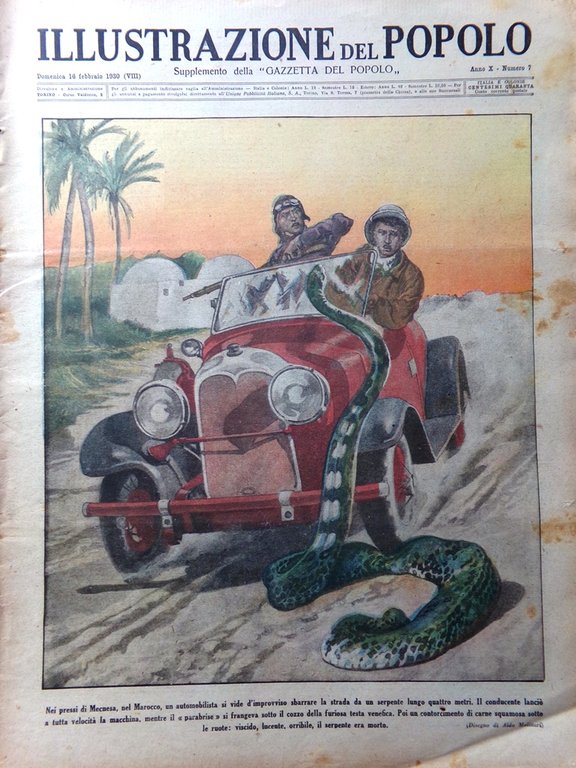Nei pressi di Mecnesa, nel Marocco, un automobilista si vide d'improvviso sbarrare la strada da un serpente lungo quattro metri. Il conducente lanciò a tutta velocità la macchina, mentre il "parabrise" si frangeva contro il cozzo della furiosa testa venefica. Poi un contorcimento di carne squamosa sotto le ruote: viscido, lucente, orribile, il serpente era morto (Aldo Molinari)