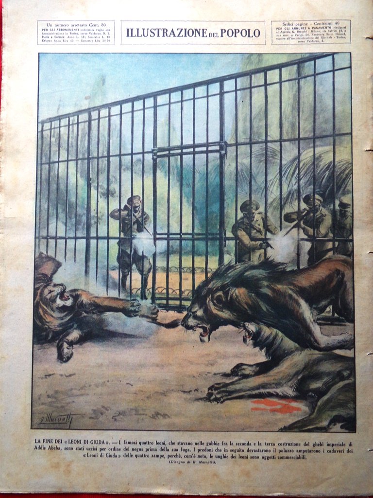 La fine dei "leoni di Giuda" - i famosi quattro leoni, che stavano nelle gabbie fra la seconda e la terza costruzione del ghebì imperiale di Addis Abeba, sono stati uccisi per ordine del negus prima della sua fuga. I predoni che in seguito devastarono il palazzo amputarono i cadaveri dei "Leoni di Giuda" delle quattro zampe, perché, com'è noto, le unghie dei leoni sono oggetti commerciabili (E. Mainetti)