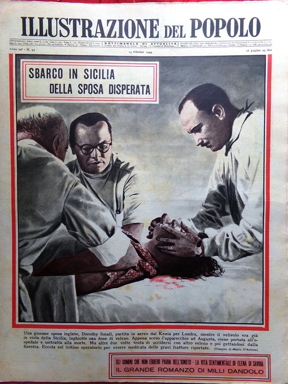 Una giovane sposa inglese, Dorothy Small, partita in aereo dal Kenia per Londra, mentre il velivolo era già in vista della Sicilia, inghiotte una dose di veleno. Appena sceso l'apparecchio ad Augusta, viene portata all'ospedale e sottratta alla morte. Ma altre due volte tenta di uccidersi con altro veleno e poi gettandosi dalla finestra. Eccola sul lettino operatorio per essere medicata dalle gravi fratture riportate (Mario D'Antona)