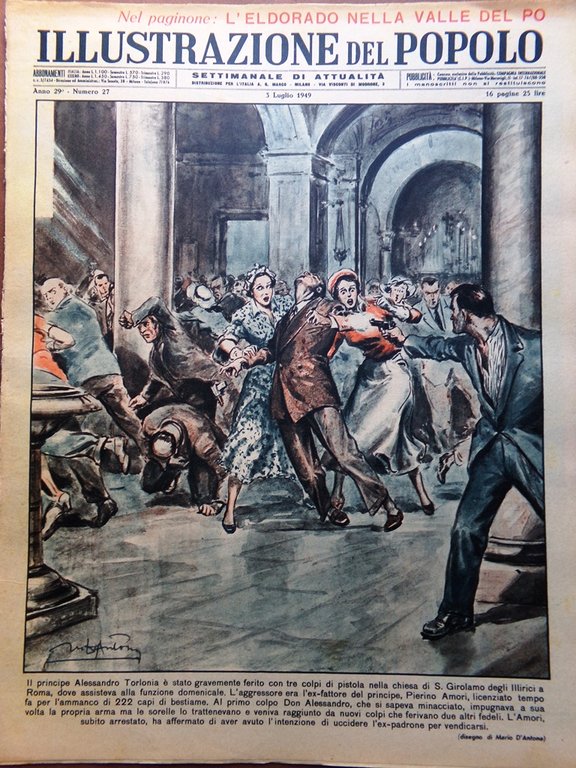Il principe Alessandro Torlonia è stato gravemente ferito con tre colpi di pistola nella chiesa di S. Girolamo degli Illirici a Roma, dove assisteva alla funzione domenicale. L'aggressore era l'ex-fattore del principe, Pierino Amori, licenziato tempo fa per l'ammanco di 222 capi di bestiame. Al primo colpo Don Alessandro, che si sapeva minacciato, impugnava a sua volta la propria arma ma le sorelle lo trattenevano e veniva raggiunto da nuovi colpi che ferivano due altri fedeli. L'Amori, subito arrestato, ha affermato di aver avuto l'intenzione di uccidere l'ex-padrone per vendicarsi (Mario D'Antona)