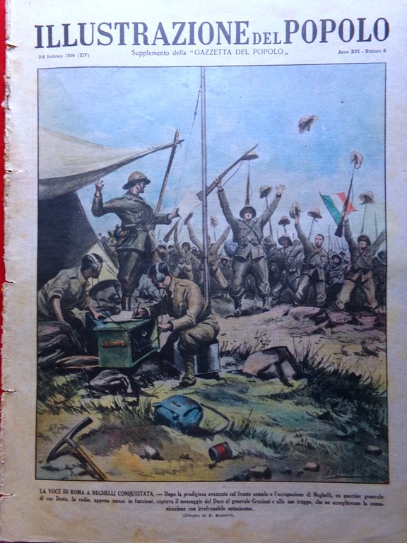 La voce di Roma a Neghelli conquistata: dopo la prodigiosa avanzata sul fronte somalo e l'occupazione di Neghelli, ex quartiere generale di ras Desta, la radio, appena messa in funzione, captava il messaggio del Duce al generale Graziani e alle sue truppe, che ne accoglievano la comunicazione con irrefrenabile entusiasmo (E. Mainetti)