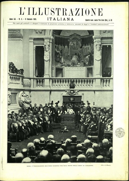 In-4, brossura, mancante delle pagine pubblicitarie ma in buono stato. In questo numero:Roma: l'inaugurazione dell'anno giuridico nell'Aula Magna della Corte di Cassazione.