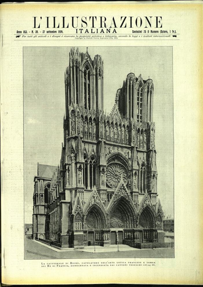 In-4, brossura. In buono stato di conservazione. In questo numero:La cattedrale di Reims, capolavoro dell'arte gotica francese e tomba dei Re di Francia, bombardata e incendiata dai cannoni tedeschi.