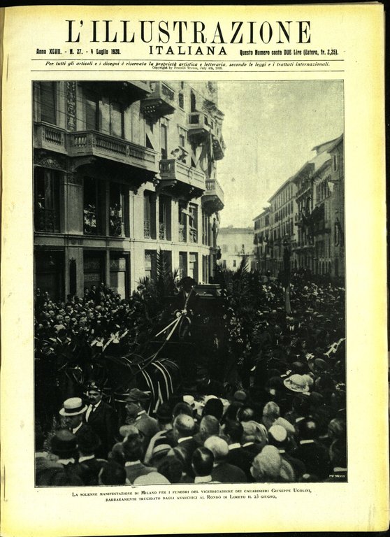 In-4, brossura (dorso cucito). In buono stato di conservazione. In questo numero:La solenne manifestazione di Milano per i funebri del vicebrigadiere dei carabinieri Giuseppe Ugolini, barbaramente trucidato dagli anarchici al Rondò di Loreto il 23 giugno.