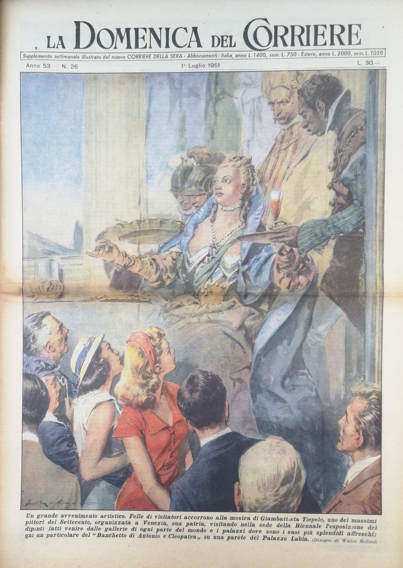 In-4, brossura, in buono stato di conservazione. In questo numero:"Un grande avvenimento artistico. Folle di visitatori accorrono alla mostra di Giambattista Tiepolo, uno dei massimi pittori del Settecento, organizzata a Venezia, sua patria, visitando nella sede della Biennale l'esposizione dei dipinti fatti venire dalle gallerie di ogni parte del mondo e i palazzi dove sono i suoi più splendidi affreschi; qui un particolare del Banchetto di Antonio e Cleopatra su una parete del Palazzo Labia.""Sei anni in una tomba di cemento armato. Nei pressi di Gdynia, Polonia, mentre si sgombrava un cumulo di macerie, sono usciti da un pertugio sotterraneo due uomini dai capelli lunghi fino alle spalle, simili a spettri. Erano due soldati tedeschi rimasti sepolti, con altri quattro, in un bunker sotterraneo semidemolito nel 1945 al momento dell'avanzata russa. Di sei, quattro erano morti. Ma pure i due superstiti non hanno resistito; uno è morto quasi subito per sincope cardiaca, l'altro dopo qualche giorno, di scorbuto.".