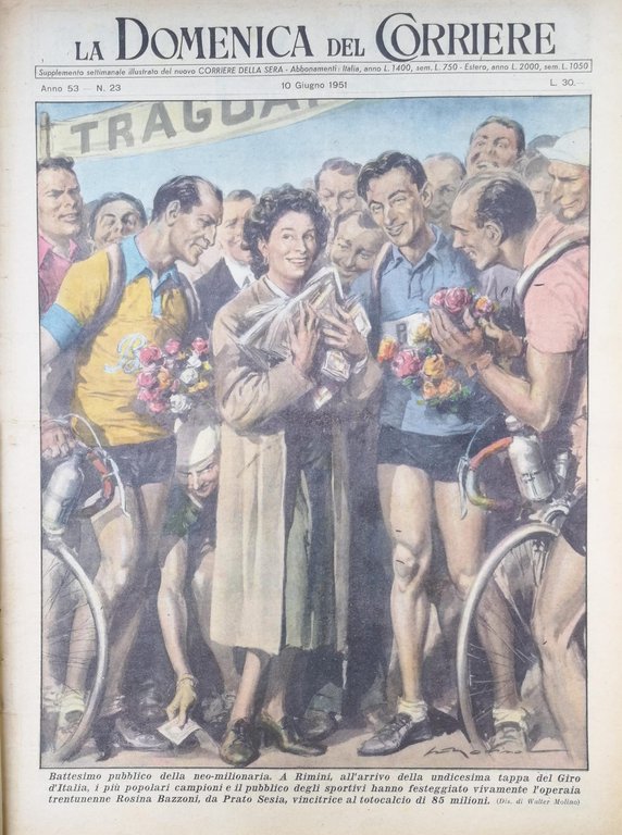 In-4, brossura, in buono stato di conservazione. In questo numero:"Battesimo pubblico della neo-milionaria. A Rimini, all'arrivo della undicesima tappa del Giro d'Italia, i più popolari campioni e il pubblico degli sportivi hanno festeggiato vivamente l'operaia trentunenne Rosina Bazzoni, da Prato Sesia, vincitrice al totocalcio di 85 milioni.""Il bel gesto di un temerario. Per raccogliere una fotografia di Evita Peron, moglie del Presidente dell'Argentina, che gli era caduta nella fossa dei leoni allo zoo di Buenos Aires, un giovane si è lanciato nella buca e, raccolto il ritratto, ha tenuto a bada le belve con giornali accesi finché i guardiani l'hanno salvato.".