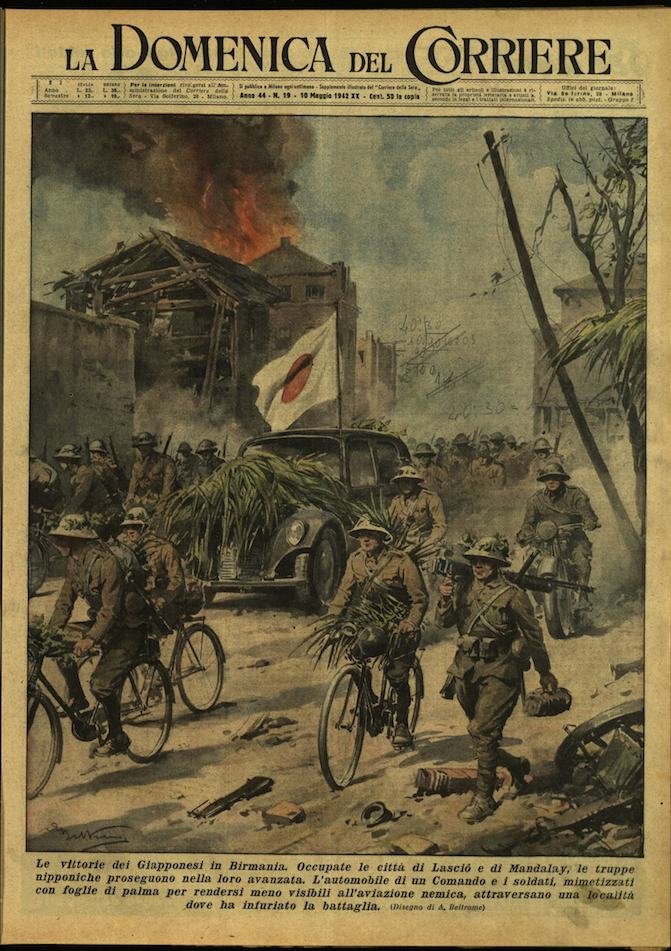 In-4, brossura, in buono stato di conservazione. In questo numero:"Sorprese nel deserto. Gli inglesi, fuggendo da una posizione battuta dalle nostre artiglierie presso El Mechili, si sono trascinati dietro una compagnia di artisti girovaghi inviati dal comando per tonificare le truppe. Solo, tra la sabbia e i resti della battaglia, è rimasto un pianoforte. Un soldato dell'Asse si ricorda di essere pianista e improvvisa un concertino all'aperto, tutto per se.""Le vittorie dei Giapponesi in Birmania. Occupate le città di Lascio e di Mandalay, le truppe nipponiche proseguono nella loro avanzata. L'automobile di un Comando e i soldati, mimetizzati con foglie di palma per rendersi meno visibili all'aviazione nemica, attraversano una localita dove ha infuriato la battaglia.".