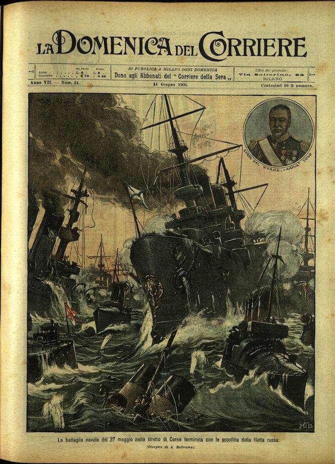 In-4, brossura, in buono stato di conservazione. In questo numero:"Attentato anarchico contro il re di Spagna ed il presidente Loubet, a Parigi, nella notte del 1 corrente.""La battaglia navale del 27 maggio nello stretto di Corea terminata con la sconfitta della flotta russa.".