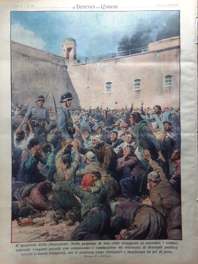 Il momento della liberazione. Nella prigione di una città strappata ai sovietici, i soldati tedeschi vengono accolti con entusiasmo e commozione da centinaia di detenuti politici, vecchi e donne compresi, che li salutano come liberatori e implorano un po' di pane (Achille Beltrame)