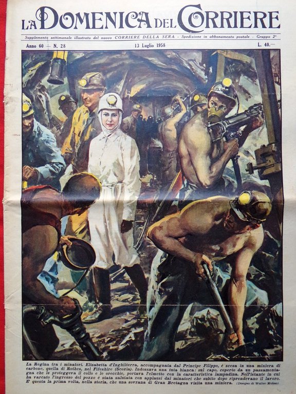 Elisabetta d'Inghilterra, accompagnata dal Principe Filippo è scesa in una miniera di carbone, quella di Rothes, nel Fifeshire (Scozia), fra gli applausi dei minatori. È questa la prima volta, nella storia, che una sovrana di Gran Bretagna visita una miniera (Walter Molino)