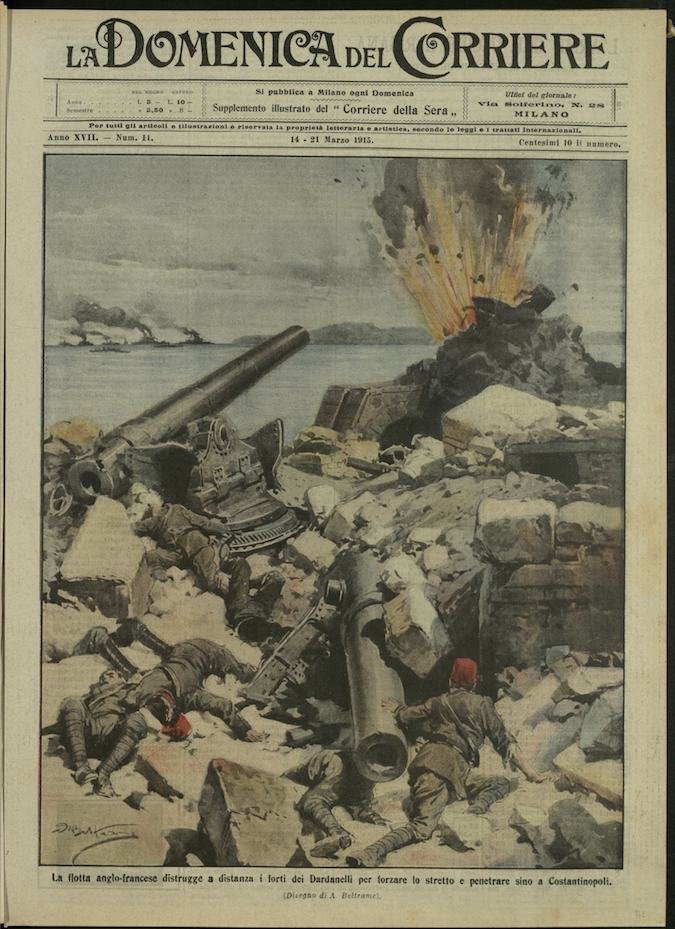 In-4, brossura, in buono stato di conservazione. In questo numero:"Trincea francese nella Champagne inondata dai tedeschi di petrolio e poi incendiata con le bombe, torrenti di fuoco sui soldati.""La flotta anglo-francese distrugge a distanza i forti dei Dardanelli per forzare lo stretto e penetrare sino a Costantinopoli.".