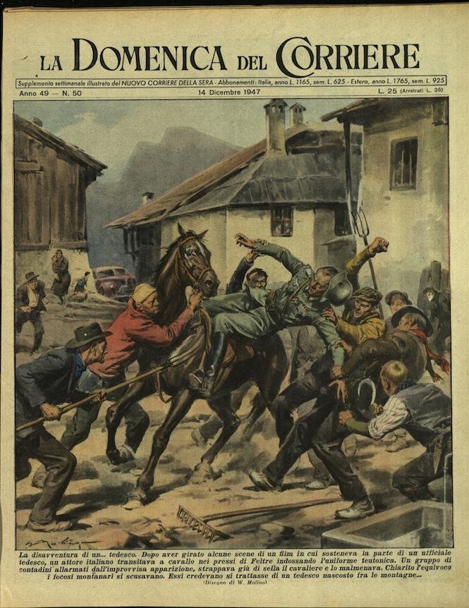 In-4, brossura, in buono stato di conservazione. In questo numero:"Una sinfonia.. incompiuta. In un paesino olandese, la banda e in piazza e suona. Ad un tratto, da un vicolo irrompe un branco di cavalli fuggito da una stalla, si precipita sui suonatori e ne nasce un pittoresco parapiglia.""La disavventura di un.. tedesco. Dopo aver girato alcune scene di un film in cui sosteneva la parte di un ufficiale tedesco, un attore italiano transitava a cavallo nei pressi di Feltre indossando l'uniforme teutonica. Un gruppo di contadini allarmati dall'improvvisa apparizione, strappava giù di sella il cavaliere e lo malmenava. Chiarito l'equivoco i focosi montanari si scusavano. Essi credevano si trattasse di un tedesco nascosto fra le montagne..".