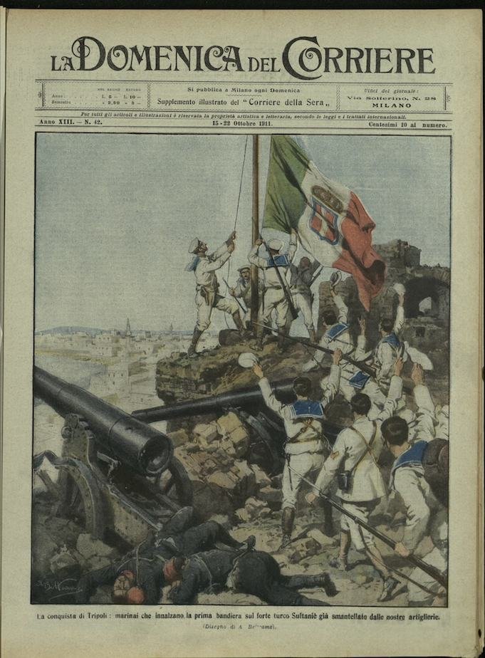 In-4, brossura, in buono stato di conservazione. In questo numero:"Guerra italo-turca, arabi dei dintorni di Tripoli che fanno atto di sottomissione all'Italia a bordo della corazzata Benedetto Brin.""La conquista di Tripoli, marinai che innalzano la prima bandiera sul forte turco Sultanie già smantellato dalle nostre artiglierie.".