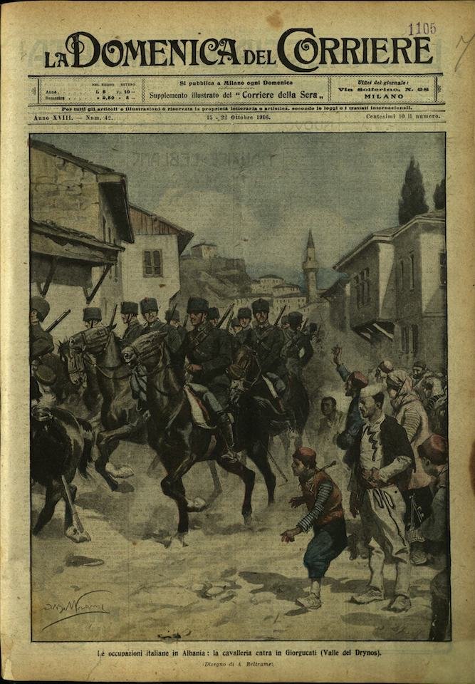 In-4, brossura, in buono stato di conservazione. In questo numero:"Un mostro aereo che non ha fatto ritorno in Germania, la distruzione dello Zeppelin L 31 nel cielo di Londra.""Le occupazioni italiane in Albania, la cavalleria entra in Giorgucati (Valle del Drynos).".