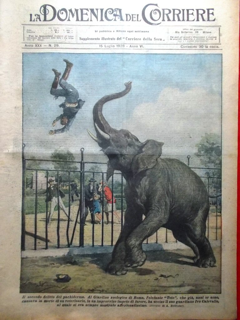 Il secondo delitto del pachiderma. Al Giardino zoologico di Roma, l'elefante "Toto" che già anni or sono causava la morte di un veterinario, in un improvviso impeto di furore ha ucciso il suo guardiano Ivo Calevalle al quale si era sempre mostrato affezionatissimo (Achille Beltrame)