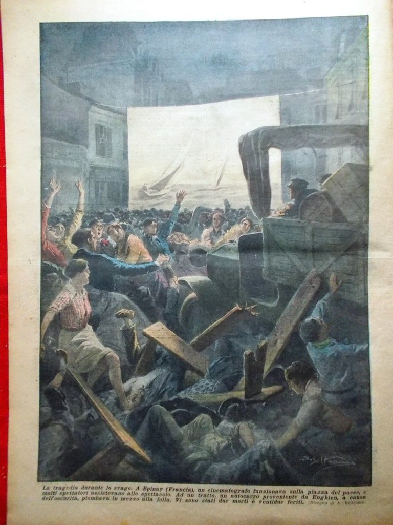 La tragedia durante lo svago. A Epinay (Francia) un cinematografo funzionava sulla piazza del paese e molti spettatori assistevano allo spettacolo. A un tratto un autocarro proveniente da Enghien, a causa dell'oscurità, piombava in mezzo alla folla. Vi sono stati due morti e 22 feriti (Achille Beltrame)