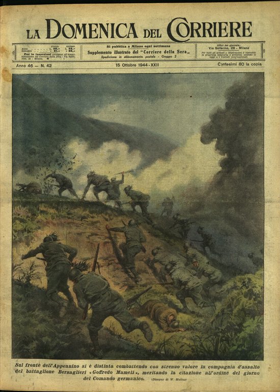 In-4, brossura, in buono stato di conservazione. In questo numero:"Sul fronte dell'Appennino si è distinta combattendo con strenuo valore la compagnia d'assalto del battaglione Bersaglieri Goffredo Mameli, meritando la citazione all'ordine del giorno del Comando germanico.""L'Eroina di Rimini. Richiesta di un'indicazione stradale dalla prima pattuglia di canadesi entrata in città, una popolana di diciotto anni la guida a sfracellarsi su un campo minato, cadendovi pur essa colpita a morte. Si salva soltanto un soldato tedesco, prigioniero della pattuglia, egli si accosta alla ragazza agonizzante e ne riceve le ultime parole, Sapevo che qui esisteva un campo di mine.. vi aveva lavorato mio fratello.. Vi ho condotto gli Inglesi perchè sono stata violentata da due Australiani in una casa colonica dove ci eravamo rifugiati.. Ho seguito questa pattuglia.. volevo vendicarmi.. non sapevo come.. La sorte mi ha favorito.. Ho vendicato il mio onore..".