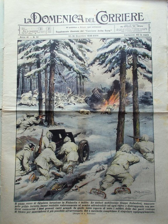 Il piano russo di fulminea invasione in Finlandia è fallito. Le audaci truppe finlandesi, nascoste nelle gelide foreste, hanno resistito al nemico distruggendo i suoi pesanti carri armati. In quelle terre coperte di neve i soldati vestono di bianco per nascondersi all'avversario (Achille Beltrame)