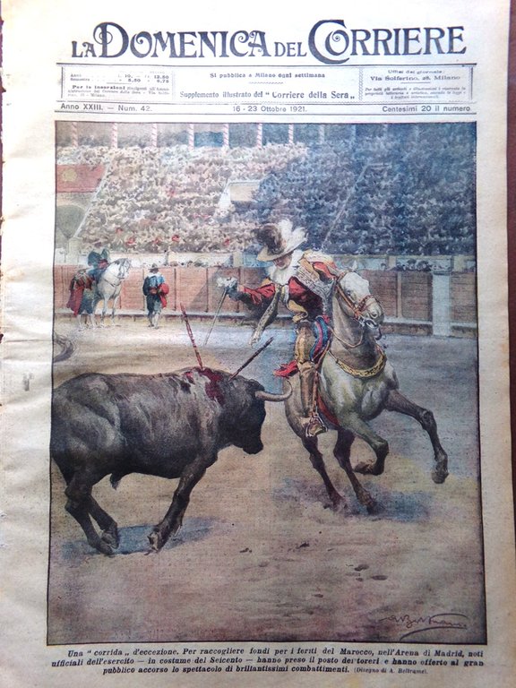 Una "corrida" d'eccezione. Per raccogliere fondi per i feriti del Marocco, nell'Arena di Madrid, noti ufficiali dell'esercito, in costume del Seicento, hanno preso il posto dei toreri e hanno offerto al gran pubblico accorso lo spettacolo di brillantissimi combattimenti (Achille Beltrame)