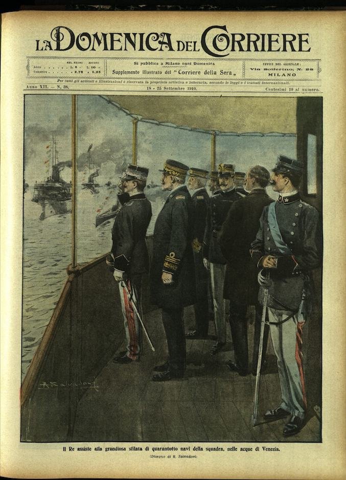 In-4, brossura, in buono stato di conservazione. In questo numero:"Il popolare torero Pepete lanciato in aria e ucciso dalla cornata di un toro, durante una corrida.""Il Re assiste alla grandiosa sfilata di quarantotto navi della squadra, nelle acque di Venezia.".