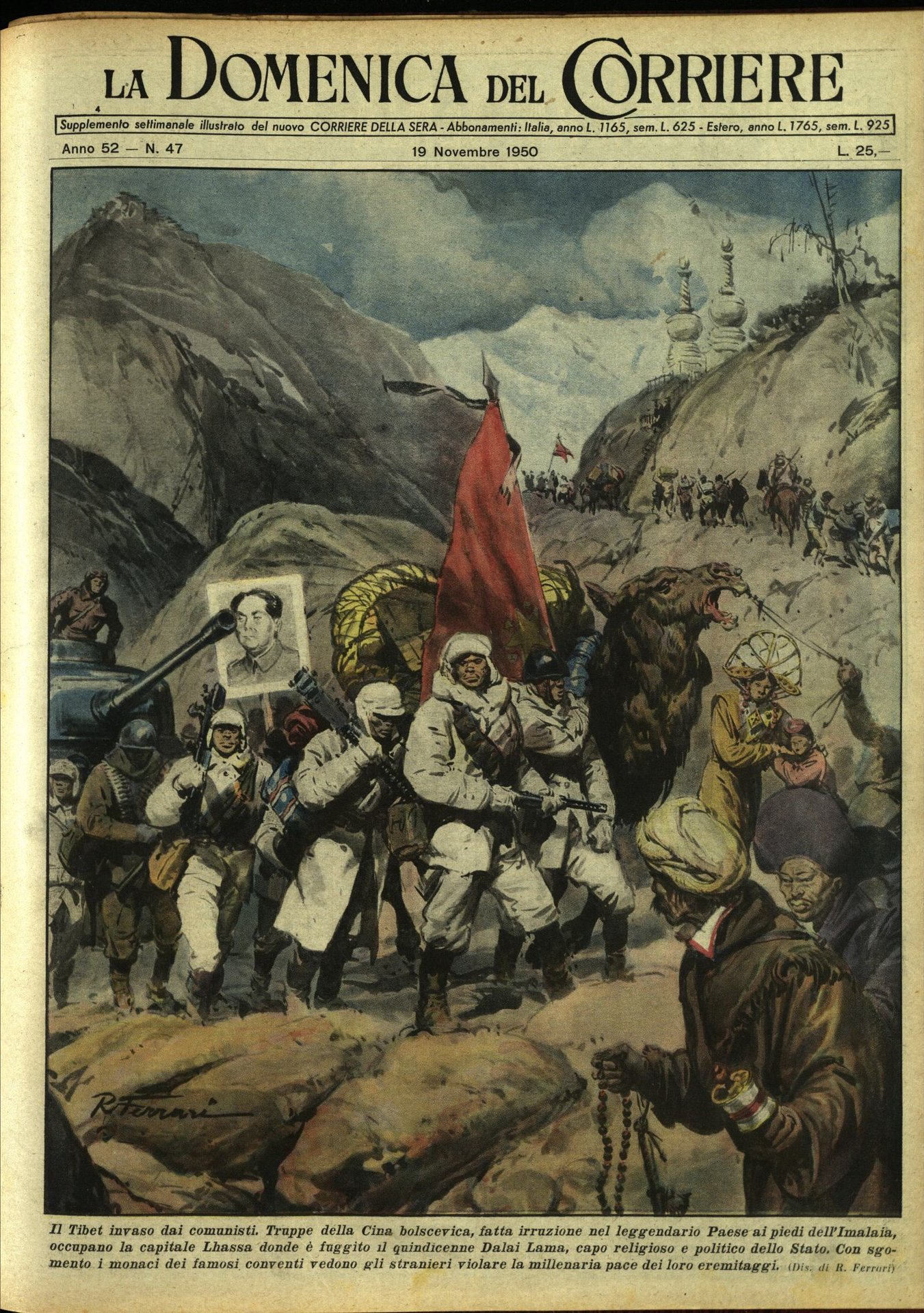 In-4, brossura, in buono stato di conservazione. In questo numero:"Il Tibet invaso dai comunisti. Truppe della Cina bolscevica, fatta irruzione nel leggendario Paese ai piedi dell'Imalaia, occupano la capitale Lhassa donde è fuggito il quindicenne Dalai Lama, capo religioso e politico dello Stato. Con sgomento i monaci dei famosi conventi vedono gli stranieri violare la millenaria pace dei loro eremitaggi.""La tragedia del Monte Bianco. Cinque guide di Chamonix, dopo ardua e pericolosissima ascesa, raggiungono i rottami del quadrimotore indiano infrantosi, con 48 persone a bordo, proprio sotto la più alta vetta d'Europa a oltre 4600 metri. Il recupero delle vittime, dilaniate per l'esplosione dell'aereo, sara possibile solo nella prossima estate.".