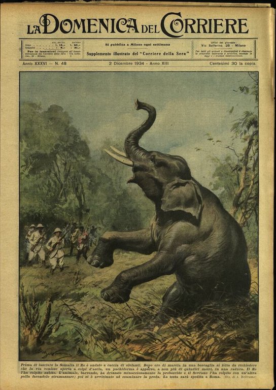 In-4, brossura, in buono stato di conservazione. In questo numero:"Prima di lasciare la Somalia il Re è andato a caccia di elefanti. Dopo ore di marcia in una boscaglia si folta da richiedere che la via venisse aperta a colpi d'ascia, un pachiderma e apparso, a non più di quindici metri, in una radura. Il Re l'ha colpito subito. L'animale, barrendo, ha drizzato minacciosamente la proboscide e il Sovrano l'ha colpito con un'altra palla facendolo stramazzare; poi si è avvicinato ad esaminare la preda. La testa sara spedita a Roma.""Uno strano incidente è accaduto in un ippodromo della California. Un fantino in allenamento aveva lanciato il proprio cavallo a velocissima corsa, quando ad una curva gli si è parato dinanzi un puledro spaurito, che galoppava in senso contrario. Nell'urto inevitabile, violentissimo, i due quadrupedi sono morti e il fantino è rimasto gravemente ferito.".