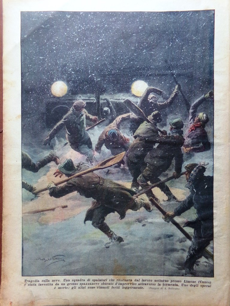 Tragedia sulla neve. Una squadra di spalatori che ritornava dal lavoro notturno presso Limone (Cuneo) è stata investita da un grosso spazzaneve sbucato d'improvviso attraverso la tormenta. Uno degli operai è morto, gli altri sono rimasti feriti leggermente (Achille Beltrame)