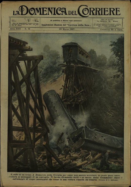 In-4, brossura, in buono stato di conservazione. In questo numero:Il salto di un treno. A Demarest, nella Georgia, per cause non ancora accertate, un ponte quasi nuovo crollava al passaggio di un convoglio. Vi furono diciassette feriti e un morto. Assai drammatico riuscì il salvataggio di cinque passeggeri che erano in una vettura rimasta sul binario. "Venti minuti sull'abisso. Il giovine Umberto Chiste, addetto alla teleferica di Sinigo (Alto Adige), mentre, imprudentemente, se ne stava con le mani strette alla fune, per l'improvviso funzionamento della macchina, veniva trascinato in paurosa corsa. Quando, dopo indicibili spasimi, raggiungeva la stazione a valle, il Chiste sveniva, e doveva essere trasportato all'ospedale.".