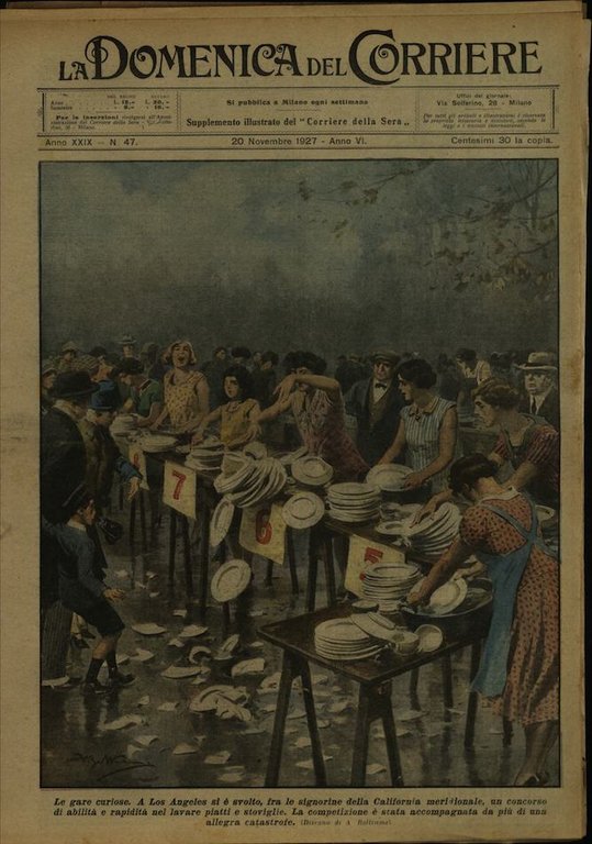 In-4, brossura, in buono stato di conservazione. In questo numero:Le gare curiose. A Los Angeles si è svolto, tra le sigonrine della California meridionale, un concorso di abilità e rpidità nel lavare piatti e stoviglie. La competizione è stata accompagnata da più di una allegra catastrofe."Il primo scontro fra un treno e un aeroplano. Il treno, proveniente da Filadelfia, era giunto nei pressi di New Marcket, quando un aeroplano, che volava a bassissima quota, a causa della nebbia intensa ando a cozzare in pieno contro il fumaiolo della locomotiva. L'aeroplano fu ridotto in pezzi, ma il pilota uscì incolume dallo scontro.".