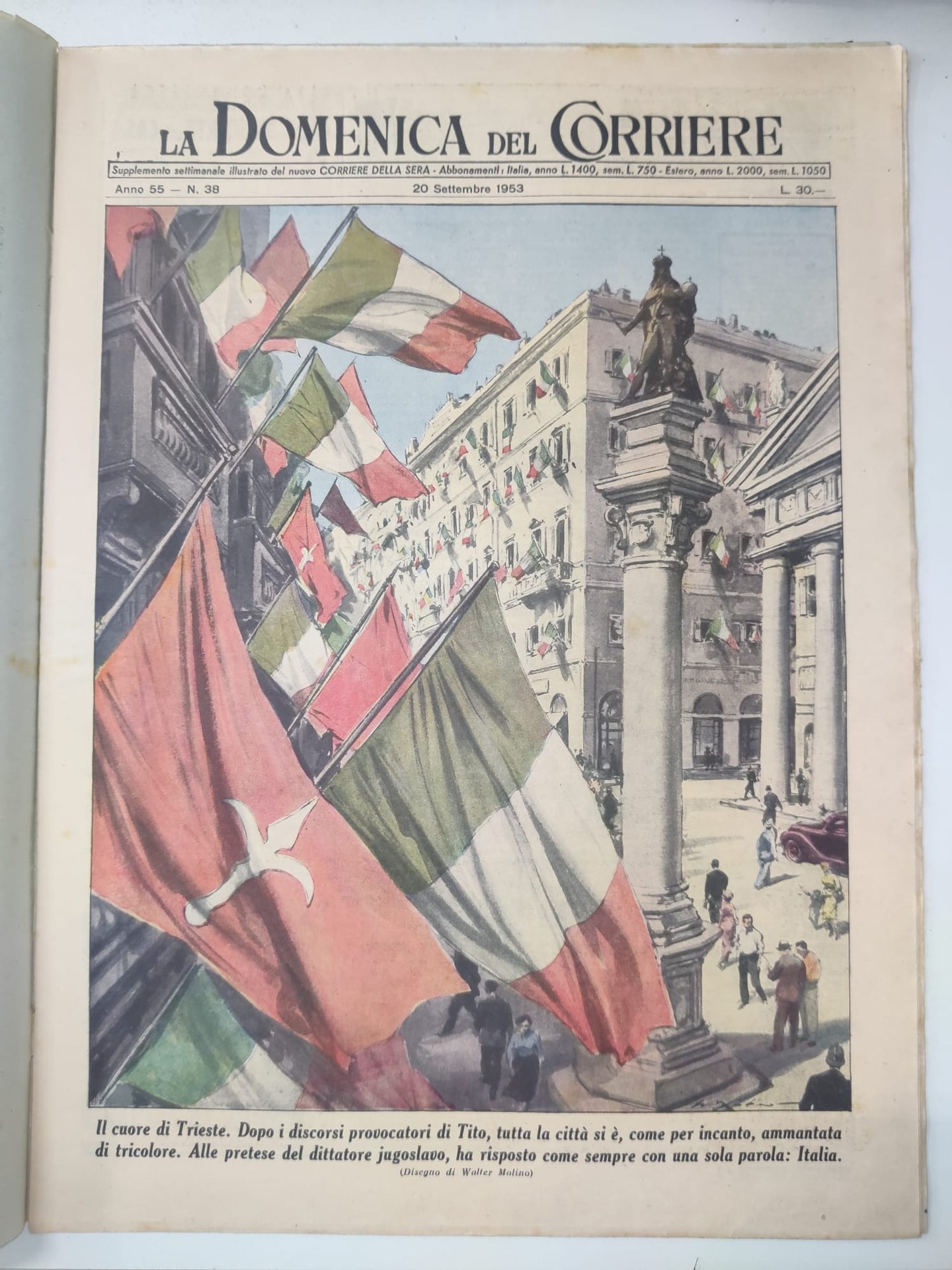 .In-4, brossura completa della pagine esterne cartoline del pubblico, in buono stato di conservazione. In questo numero:"Il cuore di Trieste. Dopo i discorsi provocatori di Tito, tutta la città si e, come per incanto, ammantata di tricolore. Alle pretese del dittatore jugoslavo, ha risposto come sempre con una sola parola, Italia.""Ha visto la Madonna. Un piccolo villaggio fra Calais e Boulogne (Francia) è stato messo a rumore da un bimbo di 10 anni, Pierre Lavoisier, il quale ha affermato di avere avuto la visione della Vergine apparsagli in una grotta presso la quale stava giocando. Gli abitanti del villaggio sono subito accorsi sul posto e parecchi di essi dicono ora di aver visto anche essi nella stessa grotta una misteriosa e dolcissima figura di donna tutta aureolata di luce.".