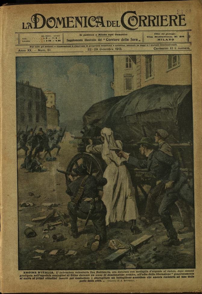 In-4, brossura, in buono stato di conservazione. In questo numero:"Eroine D'Italia. L'infermiera volontaria Ina Battistella, ora decorata con medaglia d'argento al valore, dopo essersi prodigata nell'ospedale contagiosi di Udine durante un anno di dominazione nemica, all'alba della liberazione generosamente si univa ai primi cittadini insorti per combattere e sbaragliare un battaglione Austriaco che ancora resisteva ad una delle porte della citta.""Un pit oresco corteo per la Vittoria a New York. Alla testa di una grandiosa dimostrazione, sfilano le coltivatrici degli orti di guerra, nella loro simpatica uniforme e con gli utensili di lavoro abbondantemente infiorati.".