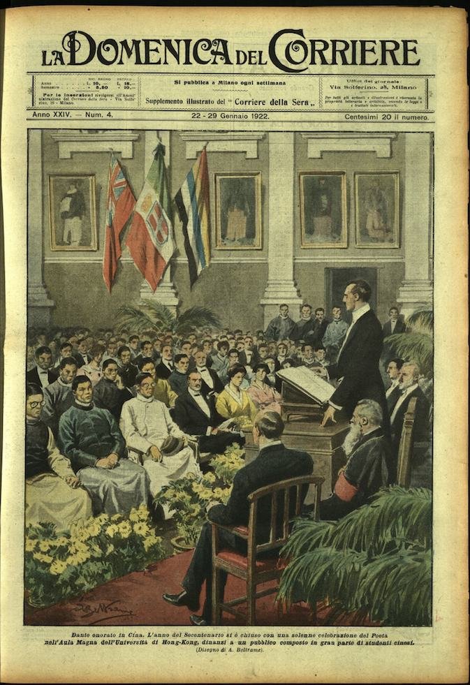 In-4, brossura, in buono stato di conservazione. In questo numero:"Per onorare il Principe di Galles in India. A Bharatpur, l'ospite agostoo puo godersi lo spettacolo di un magnifico leone, emblema dello Stato, mandato ad incontrarlo incatenato sopra un carro speciale; e quello di un fachiro che danza a piedi nudi su affilatissime lame.""Dante onorato in Cina. L'anno del Secentenario si è chiuso con una solenne celebrazione del Poeta nell'Aula Magna dell'Universita di Hong-Kong, dinanzi a un pubblico composto in gran parte di studenti cinesi.".