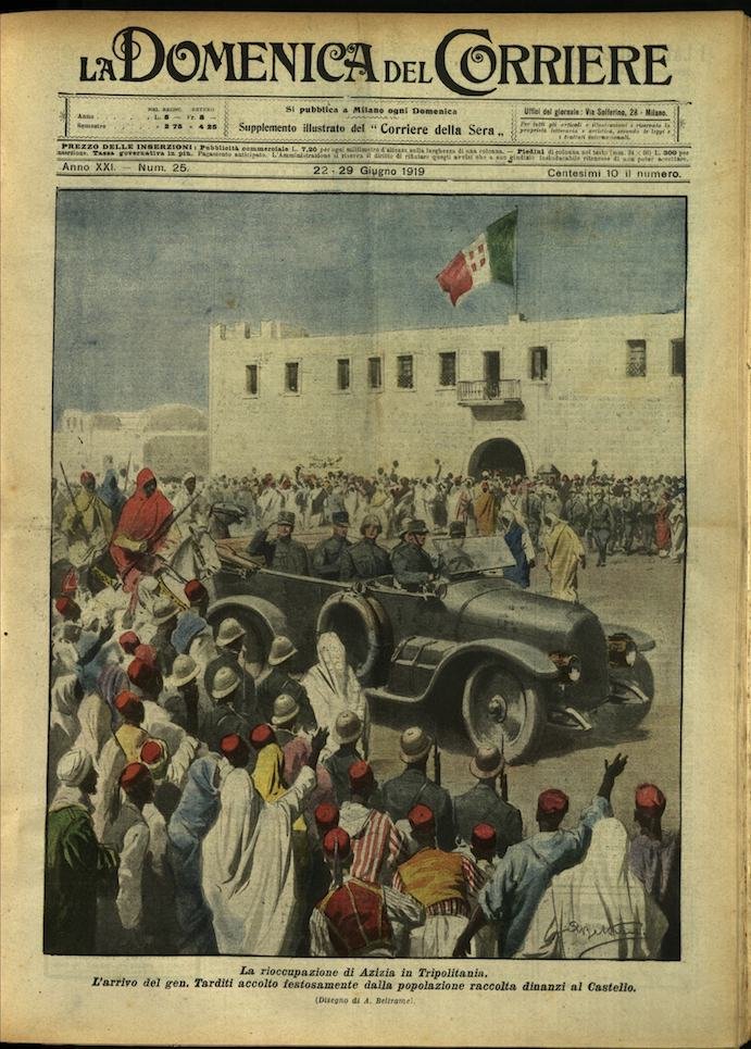In-4, brossura, in buono stato di conservazione. In questo numero:"La guerra inspiratrice della moda. Le spiagge inglesi sono ora invase da bagnanti che indossano arlecchineschi costumi indubbiamente suggeriti dai mascheramenti che tanto furono utili, specialmente in mare, durante la guerra. Ma il trucco delle navi aveva uno scopo, e quello dei bagnanti non ne ha; per ciò si puo prevedere che la nuova stranezza avra brevissima vita.""La rioccupazione di Azizia in Tripolitania. L'arrivo del gen Tarditi accolto festosamente dalla popolazione raccolta dinanzi al Castello.".