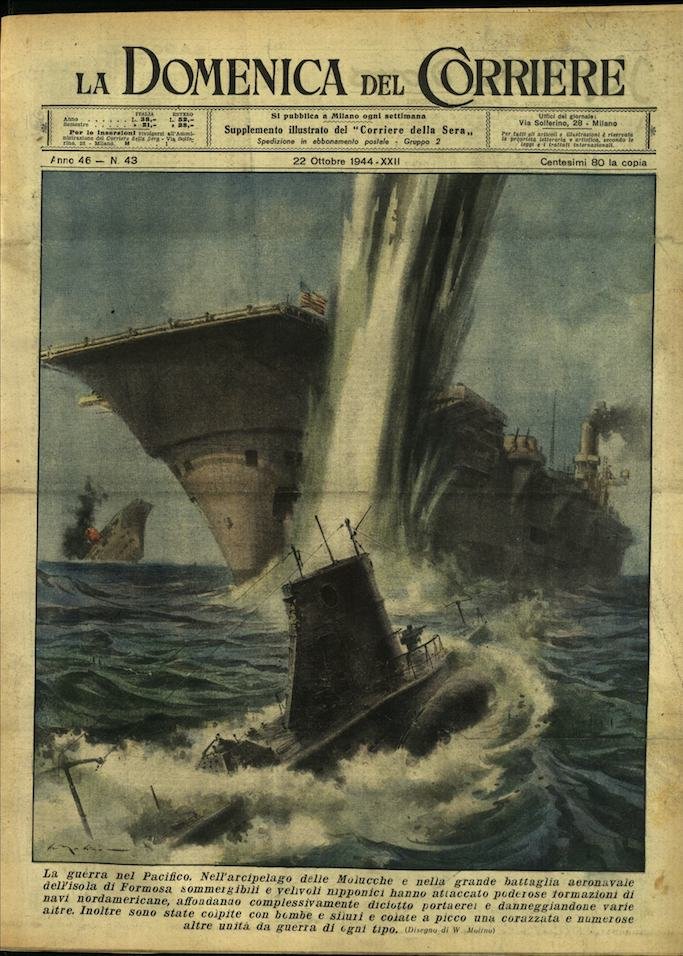 In-4, brossura, in buono stato di conservazione. In questo numero:"La guerra nel Pacifico. Nell'arcipelago delle Molucche e nella grande battaglia aeronavale dell'isola di Formosa sommergibili e velivoli nipponici hanno attaccato poderose formazioni di navi nordamericane, affondando complessivamente diciotto portaerei e danneggiandone varie altre. Inoltre sono state colpite con bombe e siluri e colate a picco una corazzata e numerose altre unita da guerra di ogni tipo.""La fame a Roma. In un articolo che descrive il dramma dei bimbi magri con le guance incavate e delle bambine ricoperte di cenci, il corrispondente romano del giornale svizzero Neue Zurcher Zeitung riporta la seguente dichiarazione della direttrice di una scuola da lui visitata, Una volta entravo in un negozio e potevo comprare un grosso pane per quattro lire; oggi invece debbo dire, sono entrata in un negozio, ho comperato mezzo pane per quattrocento lire e il pane era duro e ammuffito. Davanti al negozio sostavano numerosi bimbi sporchi e laceri che chiedevano in elemosina un pezzetto di quel pane immangiabile.".