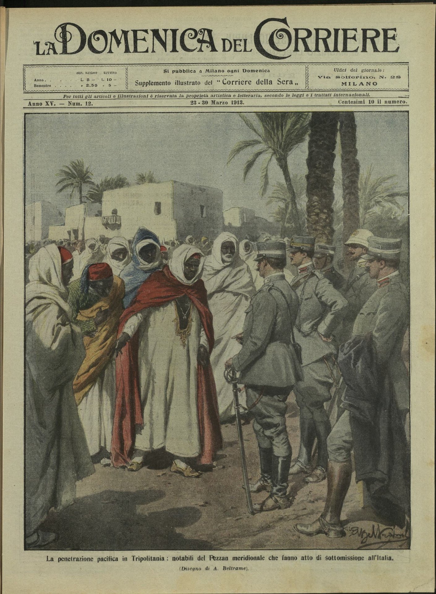 In-4, brossura, in buono stato di conservazione. In questo numero:"La penetrazione pacifica in Tripolitania, notabili del Fezzan meridionale che fanno atto di sottomissione all'Italia.""Due squadroni di cavalleria francese lanciati al galoppo, per un errato comando, uno contro l'altro, durante una manovra.".