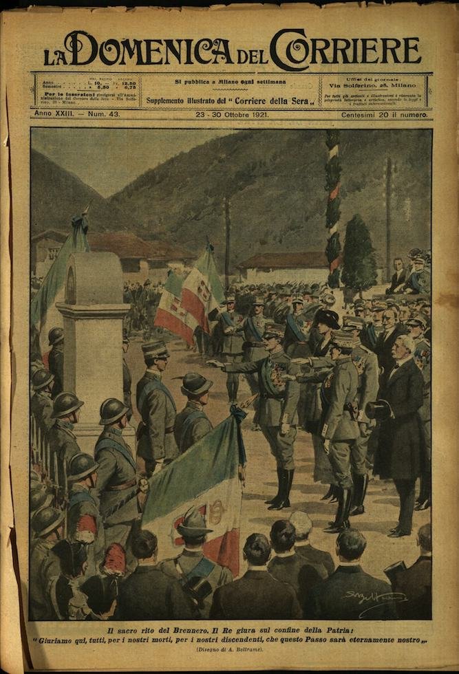 In-4, brossura, in buono stato di conservazione. In questo numero:"Un magnifico esempio di serenità nel pericolo. Durante l'affondamento del Rowan, due volte speronato, nel Mar d'Irlanda, ritta spora una zattera, una giovine donna, Miss Mincester, canta inni religiosi e canzoni per far coraggio ai naufraghi.""Il sacro rito del Brennero. Il Re giura sul confine della Patria, Giuriamo qui, tutti, per i nostri morti, per i nostri discendenti, che questo Passo sara eternamente nostro.".
