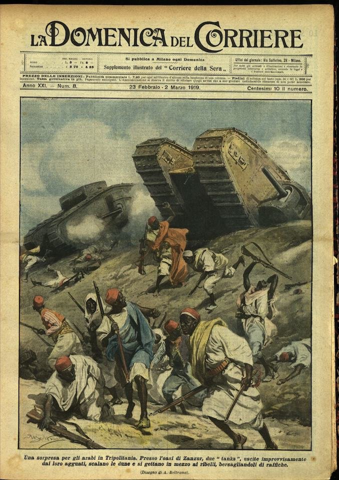 In-4, brossura, in buono stato di conservazione. In questo numero:"Sulla linea d'armistizio. La solenne cerimonia quotidiana dell'alzata del tricolore a Postumia (Adelsberg). Vi assiste il comandante del glorioso 28° Corpo d'Armata, gen Croce.""Una sorpresa per gli arabi in Tripolitania. Presso l'oasi di Zanzur, due tanks, uscite improvvisamente dai loro agguati, scalano le dune e si gettano in mezzo ai ribelli, bersagliandoli di raffiche.".