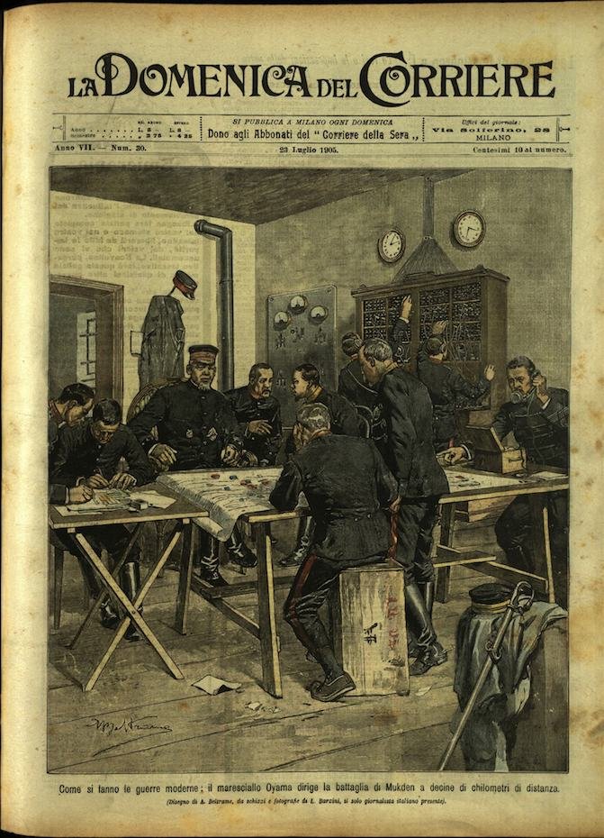 In-4, brossura, in buono stato di conservazione. In questo numero:"Mietitura tragica, scoppio della locomobile d'una trebbiatrice presso Marsiglia con vittime italiane.""Come si fanno le guerre moderne, il maresciallo Oyama dirige la battaglia di Mukden a decine di chilometri di distanza.".