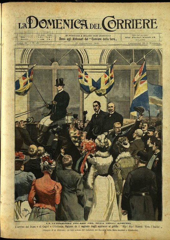 In-4, brossura, in buono stato di conservazione. In questo numero:"La spedizione polare del duca degli Abruzzi. l'arrivo del duca e di Cagni a Cristiania. Nansen da il segnale degli applausi al grido, hip! hip! hurra! viva l'Italia!""La solenne consegna alla città di Torino dell'elmo, della spada e delle medaglie del re Umberto, il duca d'Aosta bacia l'elsa della spada.".