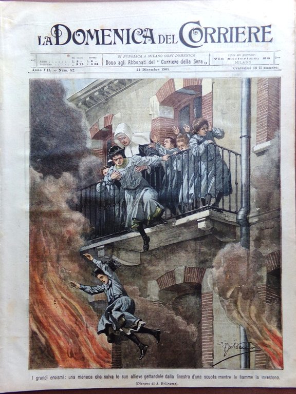 I grandi eroismi: una monaca che salva le sue allieve gettandole dalla finestra di una scuola mentre le fiamme la investono (Achille Beltrame)