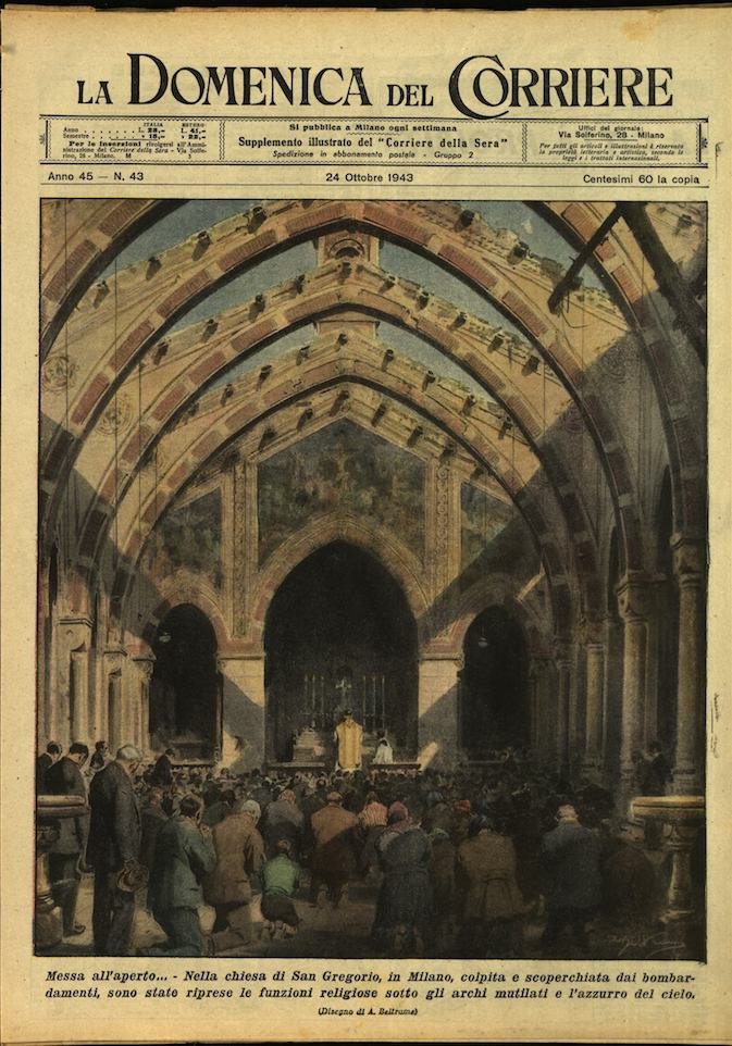 In-4, brossura, in buono stato di conservazione. In questo numero:"Messa all'aperto.. - Nella chiesa di San Gregorio, in Milano, colpita e scoperchiata dai bombardamenti, sono state riprese le funzioni religiose sotto gli archi mutilati e l'azzurro del cielo.""Tragica vendemmia. - Nel Goriziano, un agricoltore, tre suoi figli e due coloni stavano cogliendo l'uva in un vigneto, quando uno della comitiva urtava col piede una mina seminascosta tra le zolle, cagionandone l'esplosione. Straziati dalle schegge, i sei vendemmiatori morivano quasi subito.".