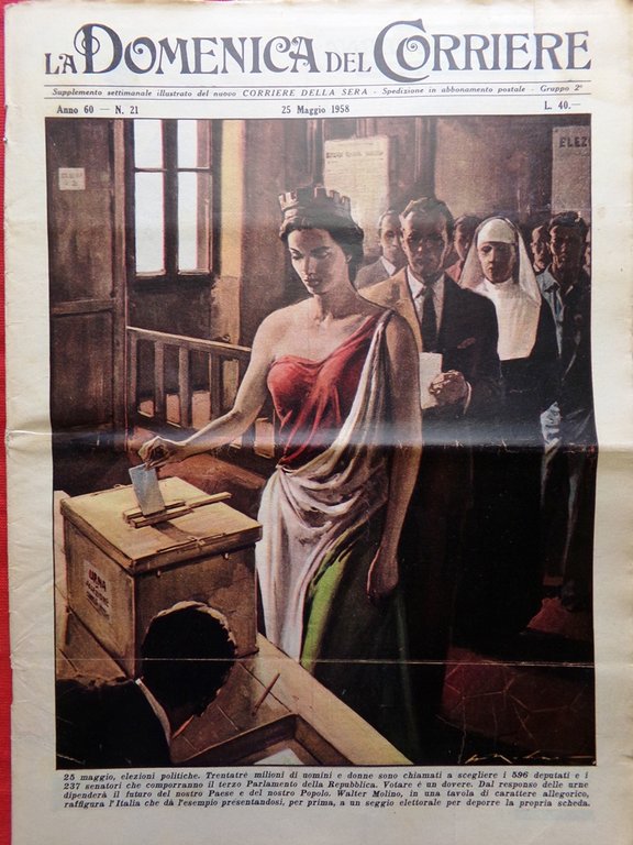 25 maggio, elezioni politiche. Trentatrè milioni di italiani sono chiamati a scegliere i 596 deputati e i 237 senatori che comporranno il terzo Parlamento della Repubblica. Votare è un dovere. Dal responso delle urne dipenderà il futuro del nostro paese e del nostro popolo (Walter Molino)