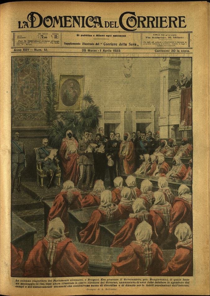 In-4, brossura, in buono stato di conservazione. In questo numero:"La solenne riapertura del Parlamento cirenaico, a Bengasi. Era presente il Governatore, gen Bongiovanni, il quale lesse un messaggio in cui, dopo avere illustrate le nuove direttive del Governo, annunziava di aver fatto iniziare lo sgombero dei campi e dei distaccamenti senussiti che costituivano causa di disordine e di disagio per le fedeli popolazioni dell'interno.""Nel paese delle stranezze. L'americano Barney Rowe si è specializzato in un pericoloso esercizio acrobatico, che manda in visibilio i suoi compatrioti. Un aeroplano, volando a una velocità di 140 Km, lascia spenzolare una scala di corda. Barney Rowe, correndo sul tetto di un direttissimo in moto, deve afferrare la scala e arrampicarsi fino al velivolo.".
